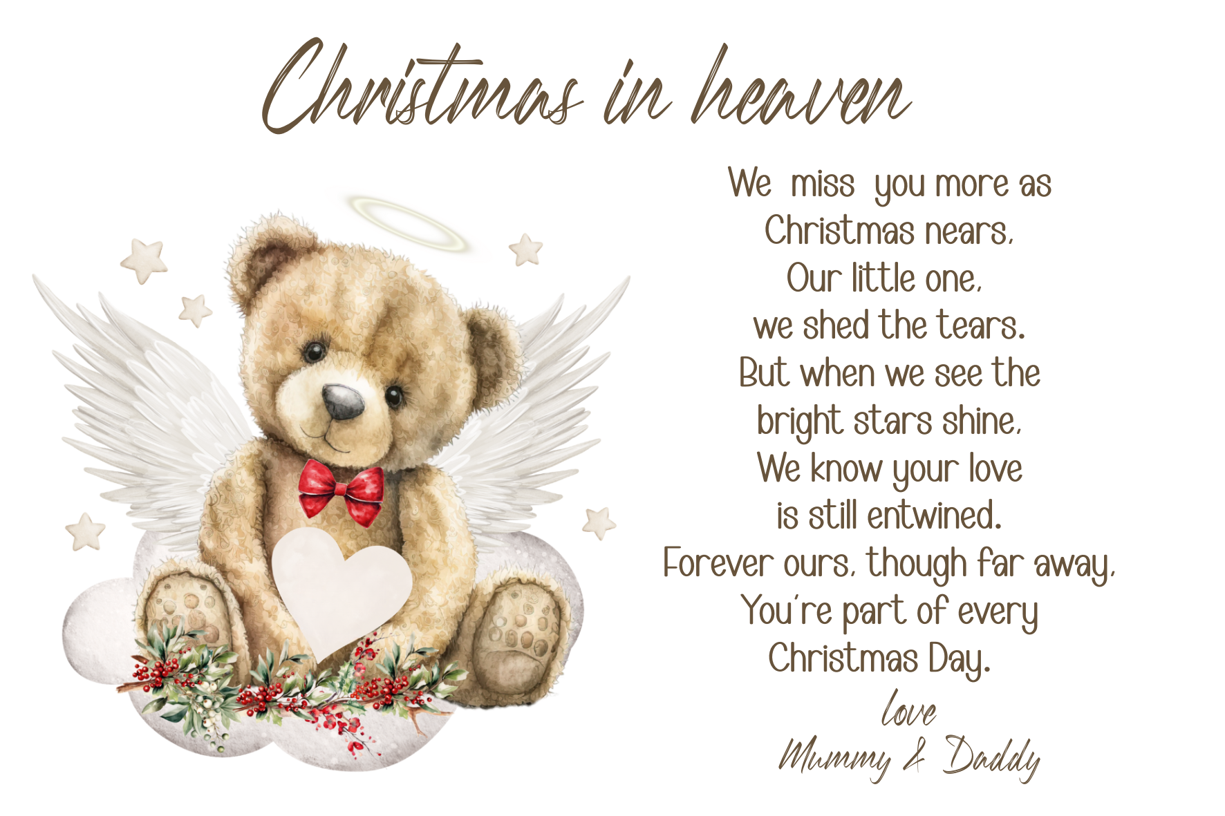 A beautiful way to keep your little one close this Christmas. This personalised grave marker features a sweet teddy bear with angel wings, holding a heart, surrounded by festive greenery. The wording can be changed from “We” to “I” (or adjusted to suit your personal message), making it a truly meaningful keepsake.