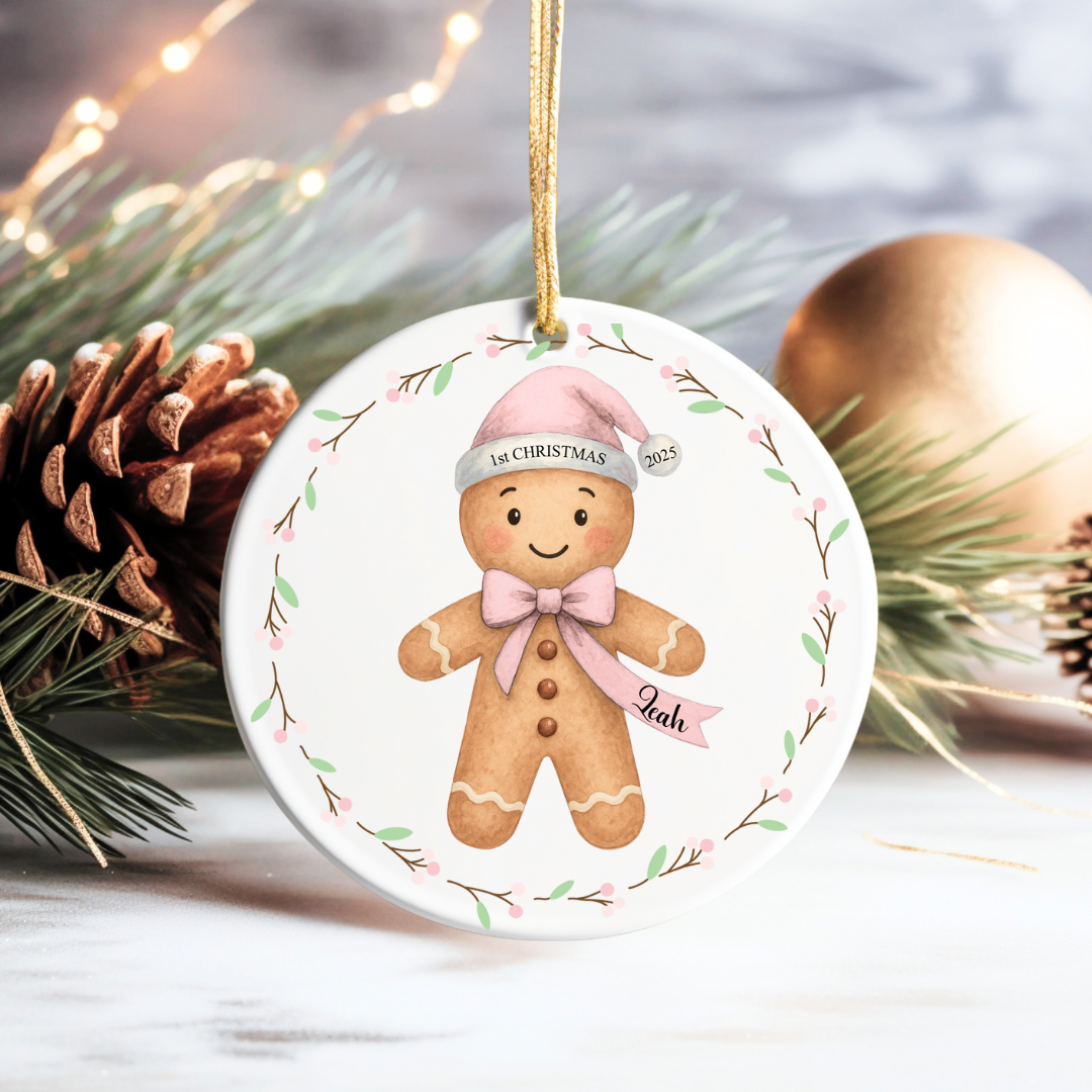 Each bauble features a sweet gingerbread design dressed in festive colours, complete with a cute little Santa hat that reads 1st Christmas 2025. Personalise it with baby’s name for that extra special touch.