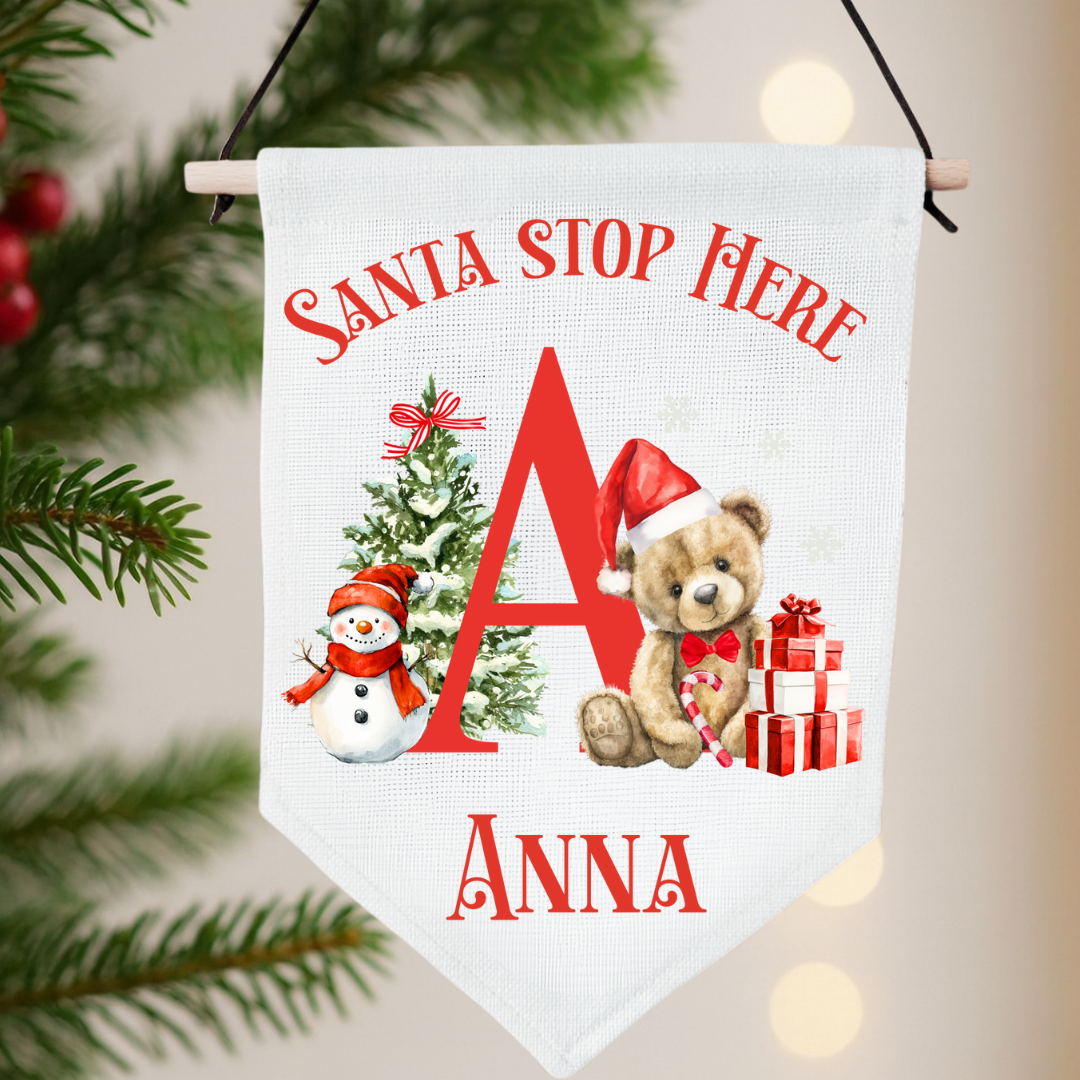 Add a magical touch to your festive décor with our personalised “Santa Stop Here” pennant flags. Each one features a sweet Christmas design with a teddy bear, snowman, and tree – perfect for hanging on the wall, door, or even by the Christmas tree.
